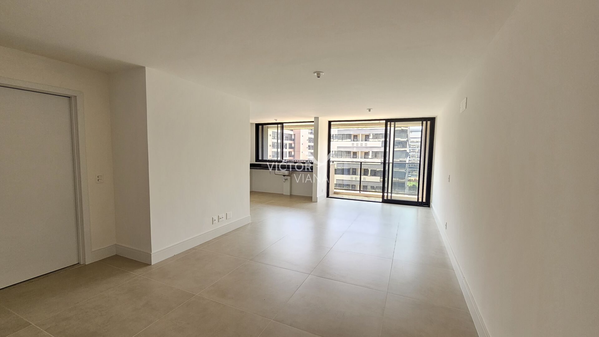 Ampla sala que tem lavabo, cozinha do tipo americana, varanda e despensa
