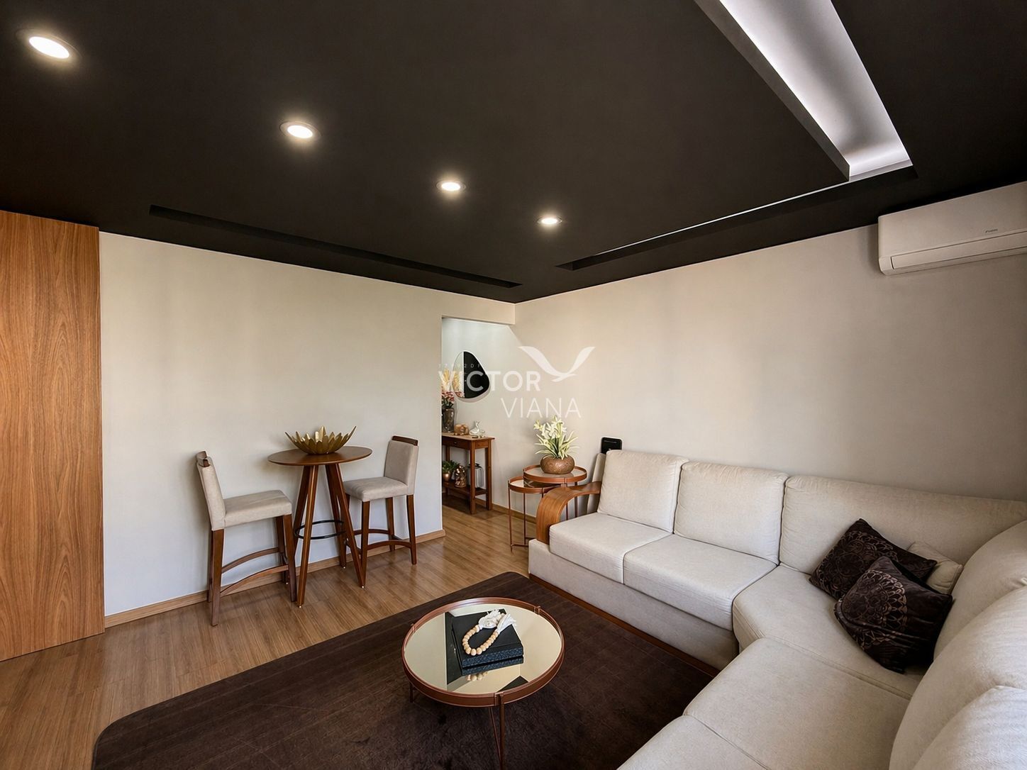 Teto da sala rebaixado em gesso com projeto de iluminação